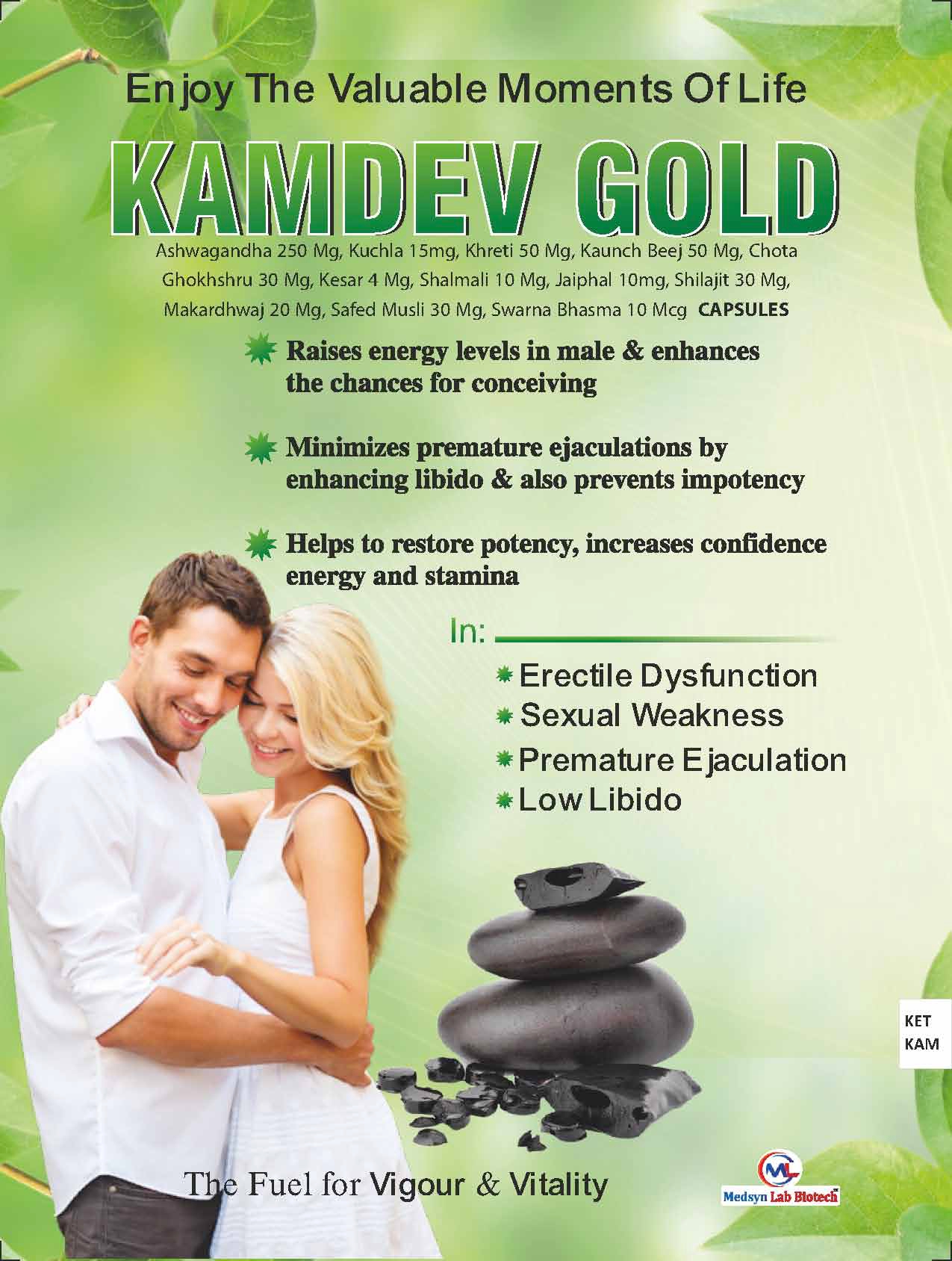 ASHWAGANDHA 250 MG + KUCHLA 15MG + KHRETI 50 MG + KAUNCH BEEJ 50 MG + CHOTA GHOKHSHRU 30 MG + KESAR 4 MG + SHALMALI 10 MG + JAIPHAL 10MG + SHILAJIT 30 MG + MAKARDHWAJ 20 MG + SAFED MUSLI 30 MG, SWARNA BHASMA 10 MCG