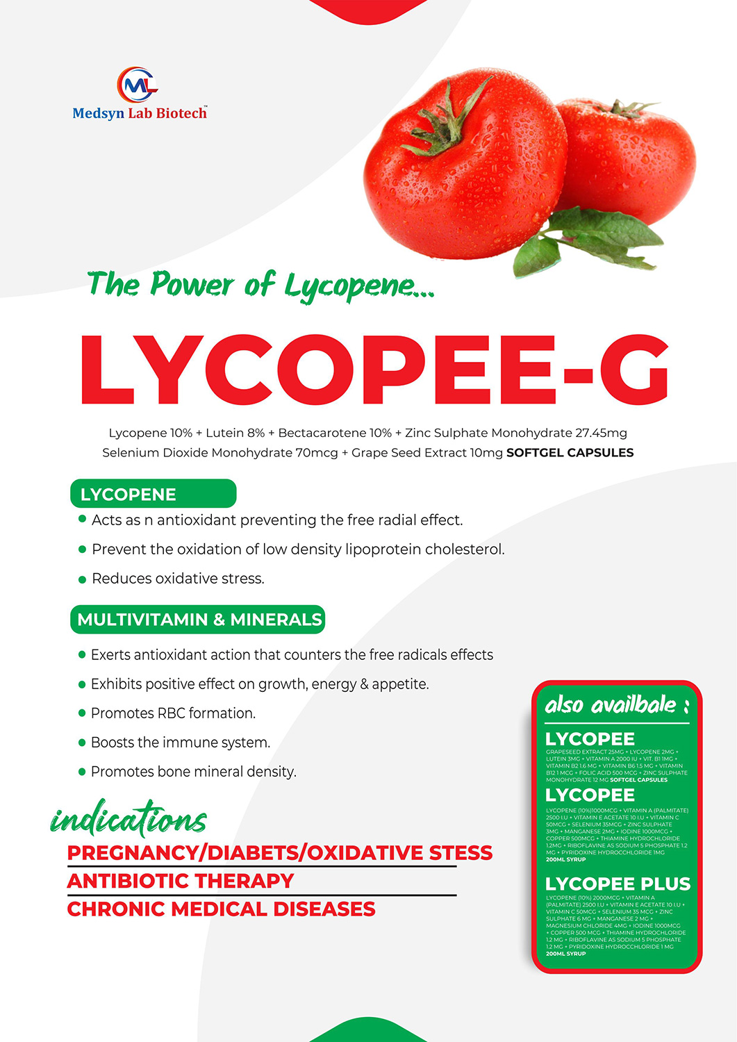 LYCOPENE (10%)1000MCG + VITAMIN A (PALMITATE) 2500 I.U + VITAMIN E ACETATE 10 I.U + VITAMIN C 50MCG + SELENIUM 35MCG + ZINC SULPHATE 3MG + MANGANESE 2MG + IODINE 1000MCG + COPPER 500MCG + THIAMINE HYDROCHLORIDE 1.2MG + RIBOFLAVINE AS SODIUM 5 PHOSPHATE 1.
